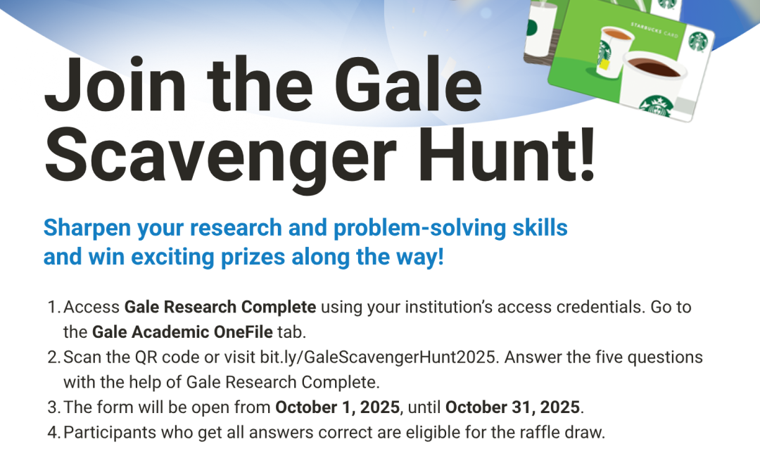 GaleScavengerHunt2025 and answer the five questions with the help of Gale Research Complete. - Participants who answer all the questions correctly will have a chance to win prizes!