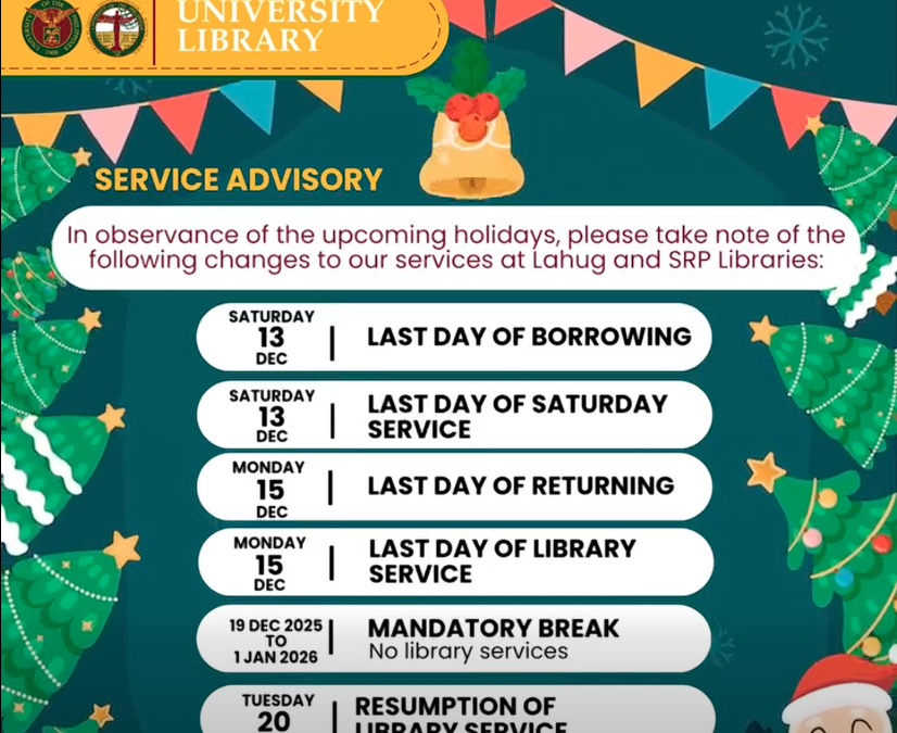 In observance of the upcoming holidays, please take note of the following changes to our services at Lahug and SRP Libraries: