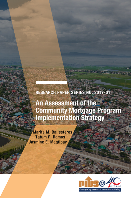 The Community Mortgage Program (CMP) is a financing scheme that enables organized residents of slums to borrow funds for land purchase and housing development. It is already considered to be the most innovative and responsive government housing program in the Philippines. Nevertheless, the CMP still has weaknesses that have not been given much attention during the years of its implementation. These issues pertain to program targeting, service delivery, and organization. This study aims to review the current processes and overall performance of the CMP, including its variants—the localized CMP and the HighDensity Housing Program. The study also provides recommendations on how the identified issues can be addressed.