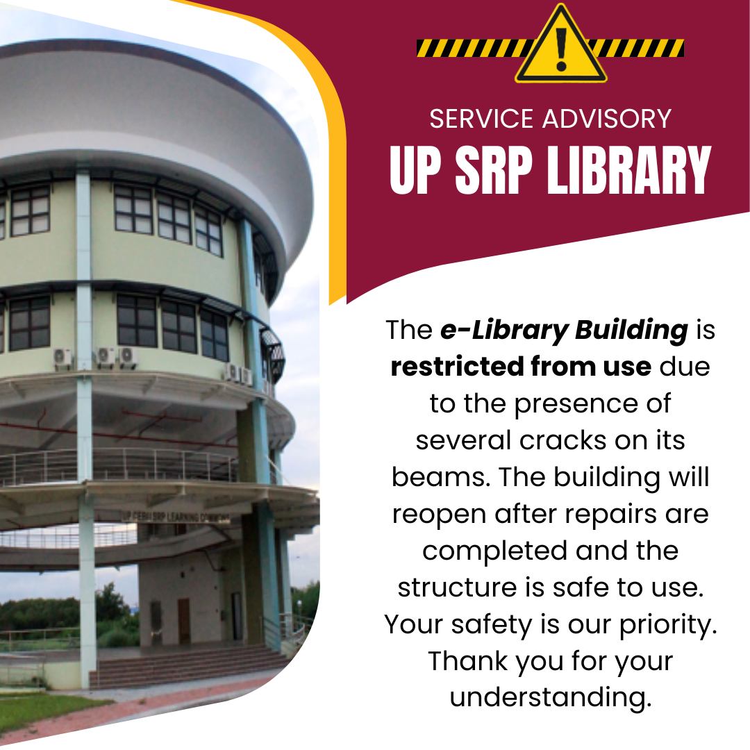 The e-Library Building is restricted from use due to the presence of several cracks on its beams. The building will reopen after repairs are completed and the structure is safe to use. Your safety is our priority. Thank you for your understanding.
